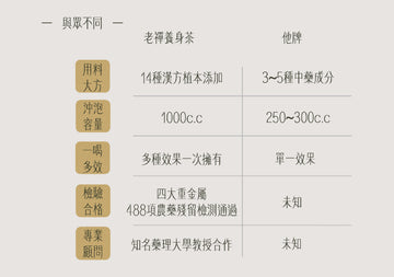 嚴選 14 種漢方草本,調和完美比例:金銀花、紅棗、枸杞、菊花、紫蘇葉、甘草、桔梗、魚腥草、黃耆、桑葉、當歸、迷迭香、川芎、紅花